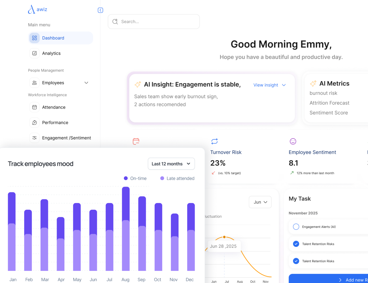 Aawiz helps organizations measure employee mood through AI-driven insights and actionable reports.