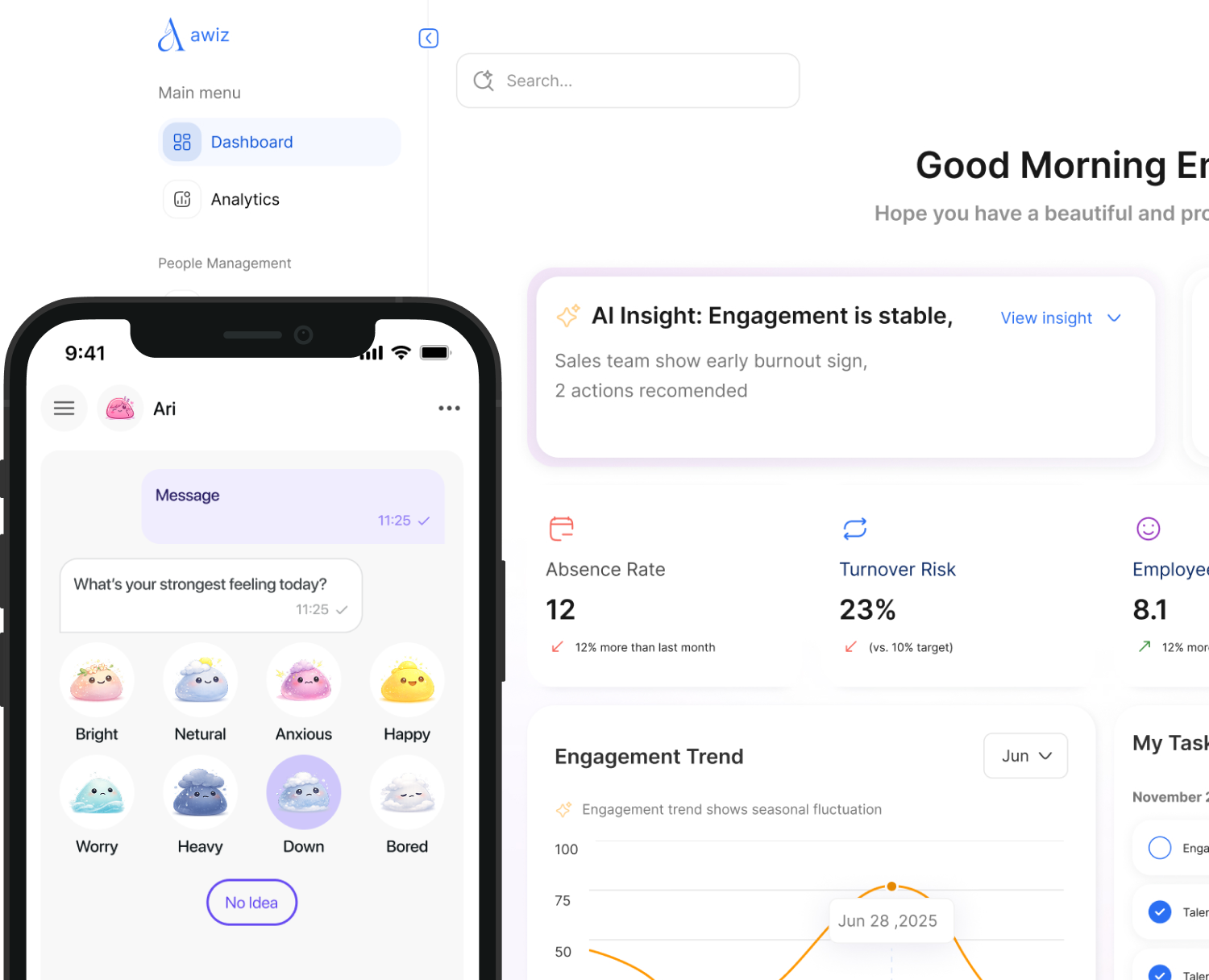 Mood Tracker is een AI-gestuurd product van Aawiz dat helpt de emotionele pulse van een organisatie te meten. Het zet stemmingsdata van medewerkers om in waardevolle inzichten en rapporten, zodat bedrijven betere beslissingen kunnen nemen en het welzijn op de werkplek verbeteren.